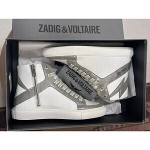 Women’s Silver high-top sneakers with laces and zip. Mix of smooth leather and contrasting glitter panel. Lightning bolt panel and Zadig&Voltaire branded tongue and laces.