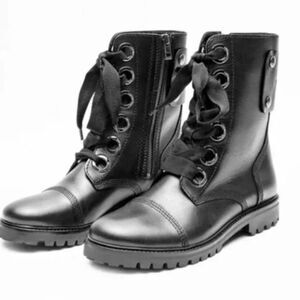 Logo-etched grommets add subtle glamour to the military-inspired look of a leather, combat boot that sits on a toothy lug sole with ribbon-like laces.