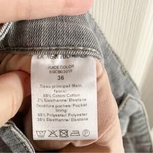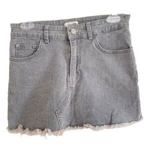 Juice (greyish blue) color frayed hem denim mini skirt. 5 pockets. Zip fly. Marked size EU36 = Size 6/Small US. NWOT.