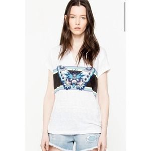 Linen t-shirt by Zadig & Voltaire, iconic Henley collar, butterfly print on the front.