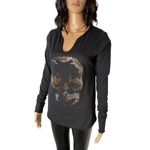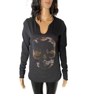 Tags: rock, skull, gothic, black, long sleeve, henley, skull graphic, diamonds, bling