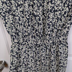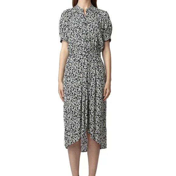 Chic Zadig & Voltaire navy and cream floral Rima crepe midi dress with flattering waist detail, pockets, and button front.
