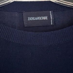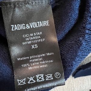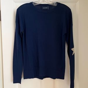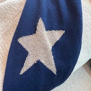 This adorable lightweight wool sweater is solid navy with the surprise of a metallic gold star on each elbow. This was purchased after I lost a lot of weight due to illness, but now I've gained the weight back so this has become too tight on me. It's made of soft merino wool and feels delicious on. It was worn only once and is in perfect condition. It's 18" pit to pit and 24" from the shoulder to the hem. It's a classic sweater with a crew neck, but the stars on the sleeve make it very unique and youthful.