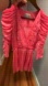 In vivid rubber pink, it features a V-neckline, three-quarter sleeves, gathered detailing, an elastic waistband, pleated skirt, and flared hem. Perfect for special occasions or as a standout everyday piece.