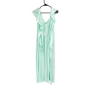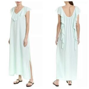 This 100% silk dress is a great summer piece. Its pale mint color is ultra-chic. A ruffled neckline and double side slits make this the perfect dress waiting to be paired with th strappiest of sandals.