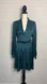 This is an elegant deep emerald, green mini dress crafted from a silky, flowing fabric that drapes beautifully. The dress features a wrap-style V-neckline, creating a flattering and feminine silhouette. The bodice has a slightly relaxed fit, enhancing the effortless appeal of the design.The three-quarter-length sleeves are gently puffed, adding a touch of vintage charm and sophistication. The skirt portion is lightly gathered at the waist and cascades down into an asymmetrical, layered hemline, creating a soft and romantic movement.