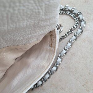 Zadig&Voltaire women’s mini zip-up clutch in white leather studded at front with tiny flash bolts, zip closure, two detachable chains, worn over the shoulder or across the body