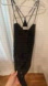 Women’s short black silk dress with all over diamanté and cross straps.