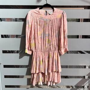 Zadig & Voltaire 'Rooka' print glam rock mini dress in orange and pink. Shirred chest with 3/4 sleeves. Button cuffs, elasticized drop waist, tiered skirt. Abstract rocker print throughout. Keyhole back with button and loop closure. Lined. Size small - 18" pit to pit; 13" drop waist; 26" length from pit.