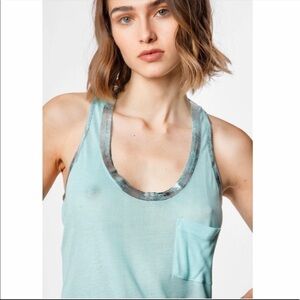Brand new! Zadig and Voltaire Samuel Foil Tank in Lagoon. Beautiful light turquoise blue hue. Lightweight knit pocket tank. Racerback with scoop neck. Rounded hemline. Hand brushed metallic silver trim. Relaxed fit. Fits TTS.