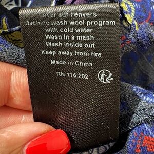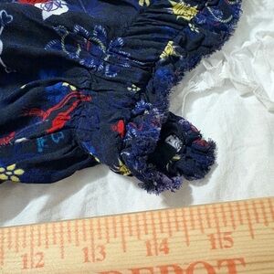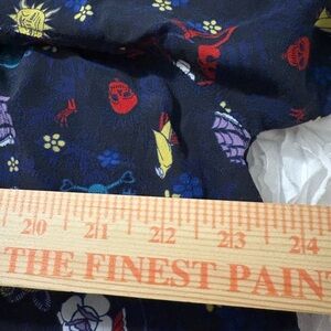 Very fun skeleton pirate print blouse. Keyhole neckline, raw hems at collar and cuffs. Soft viscose fabric. Relaxed fit. Dress up under a blazer or casually with shorts.