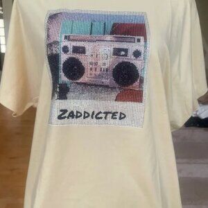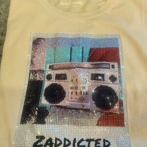 TAGS: zadig & voltaire, designer tee, tommer top, zaddicted t-shirt, womens top, yellow t-shirt, beaded detail, cotton tee, casual luxe, statement tee, graphic shirt, edgy style, parisian chic, trendy fashion, streetwear