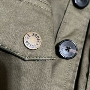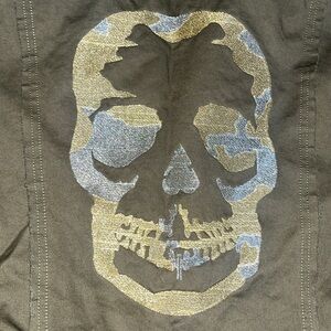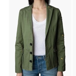 Zadig & Voltaire Virginia Camo Skull Lurex Metallic Embroidered Military Jacket Army Olive Khaki Green Medium. Distressed seams and a metallic skull lend grunge-inspired edge to a moss-green blazer sewn with plenty of pockets. Peaked lapels. Long sleeves. Faux button cuffs. Front logo buttons on two front flap pockets. Patch details. 100% cotton. Approx measurements: 17.5“ pit to pit & 23.5“ length. Great pre-owned condition. No stains/flaws. Smoke/pet free home. Offers welcome. Bundle & save. Ship same/next day. Packaged w/ care.