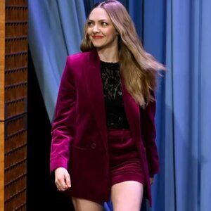 Magenta velvet blazer with shoulder pads. Fully lined with black fabric on the body and white pinstripe fabric on the sleeve. Jacket is size 34, matching shorts are size 38. Only worn once!