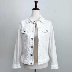 Medium Zadig & Voltaire Kikoy jacket. White denim fabric with some stretch. Two upper chest pockets and two lower pockets. Zipper and button closure. The back has a skull made out of silvery stars. Great condition!