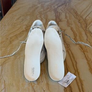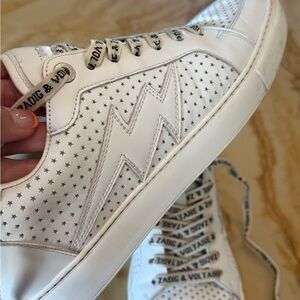 These Zadig & Voltaire sneakers feature a sleek all-white design with a perforated leather upper for enhanced breathability. The minimalist aesthetic and classic athletic silhouette make them a versatile choice for any casual occasion.