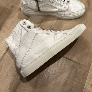 Sleek white high-top sneakers featuring a unique lightning bolt design and lace-up closure. Wear on the leather price reflects condition still in great shape for the price! Feel free to inquire!