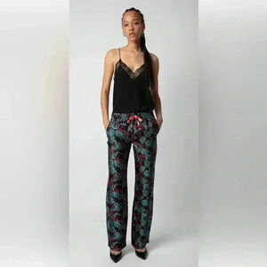 New With Tags Zadig & Voltaire “Pomy Jaquard Thunder” Noir Pants Women’s Size XS/34. Patterned drawstring, cinched at waist, two pockets. Gorgeous blue and red floral pattern on black. Designed in Paris. Approximate measurements 32” inseam, 14” waist side to side (unstretched), 11” rise, 8.5” cuff opening side to side.