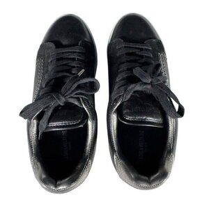 Zadig & Voltaire ZV1747 women's black leather fashion sneakers. Sneakers are black leather with black suede detailing and silver leather heels that say "Zadig & Voltaire." They featured silver studs on the sides. Shoes are a woman's EUR size 37 which translates to a US size 6.5. Org. list price $368.