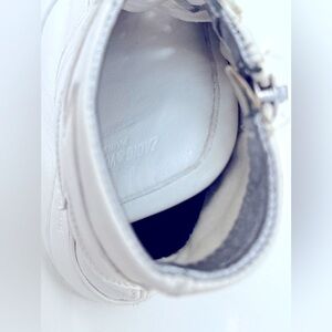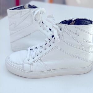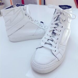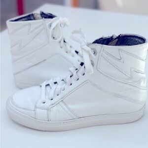 Chic and modern high-top sneakers. Sleek white design. Perfect for casual wear, these beautiful Zadig sneaks have been extensively cleaned and rehabbed. Lovely condition, with two very small areas of leather fray on inner instep. These have been fully reconditioned and polished and are ready to rock!