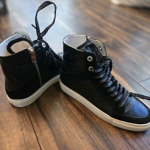 Black high-top sneakers with textured finish. White soles and branded laces. Side zipper detail.