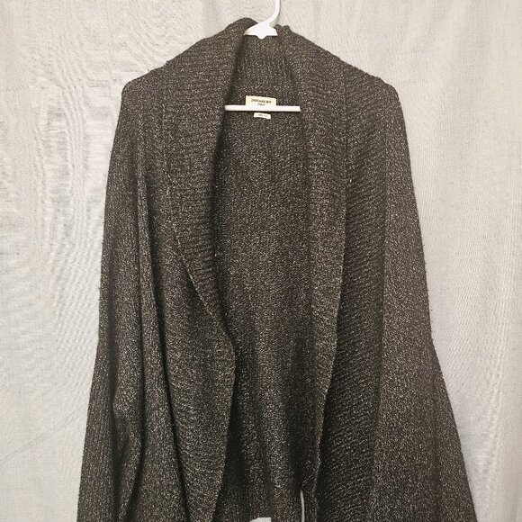 So cozy, so chic -- this oversized Zadig & Voltaire shawl-collared open cashmere cardigan is immensely versatile and stylish enough to take a pair of jeans into a cocktail party, or out for your day's errands. The cashmere knit is interwoven with silver metallic Lurex threads for a slight shimmer that flatters the skin [women in centuries past wore diamond jewelry, to give light to faces in ages that had so little indoor light]. The length is 32 inches, the natural shoulder 16.5 inches [the sleeves are very dropped, as you see], and the sleeve length is 30 slouchy inches, to be left full length, rolled, folded, or pushed up as you wish, Your questions welcomed. Thank you for looking.