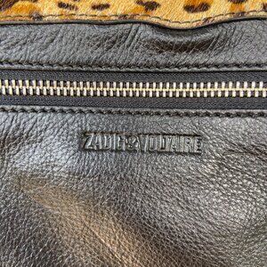 Edgy Zadig & Voltaire black leather bag featuring cheetah print. Silver hardware with a detachable chain, meaning it can be worn across the body/over the shoulder, or as a clutch.