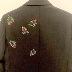 Zadig & Voltaire Venus Diamanté flower black blazer. Slightly oversized with multiple pockets, crystal Embelished floral motifs, peaked lapel, full lining, one button closure with branded button, scallop cuff detail and single back vent. Embellishment is on collar, front right, right sleeve and right side of back.