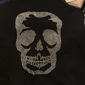 Stylish black top featuring a striking rhinestone skull design. Perfect for adding an edgy touch to your outfit. Please note there are- 2 holes in the hem by the ZV, one by the right side, one by the right chest, one in the right sleeve, and a potential wear on the middle- some of these pieces are intentionally designed to look worn, however price reflects the holes. Size large.