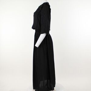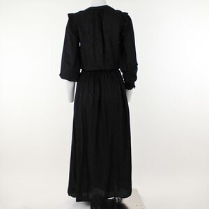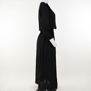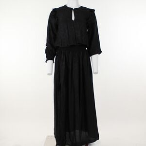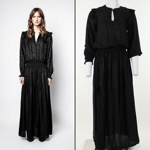 Gothic glam defines this silk-blend maxi shaped with smocking at the waist and cuffs and trimmed with deceptively sweet ruffles at the shoulders. A python-pattern jacquard subtly shimmers in the light.