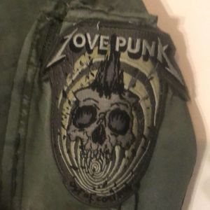 military-inspired jacket with patches, decorative snaps, and embroidered detail.