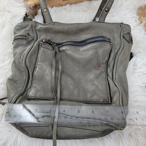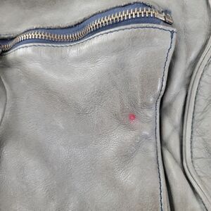 studded distressed leather olive green cargo bag with leather fringe. small red mark and some wear as shown in pictures. inside does have some stains but doesn't affect the wear. brass studs. color is a olive green. Please see photos for measurements shown. Preloved condition. All sections of interest as well any known flaws have been documented in the photos and noted as thoroughly as possible. However, if there are any questions feel free to ask.