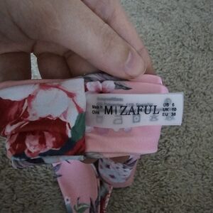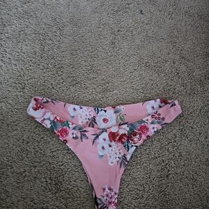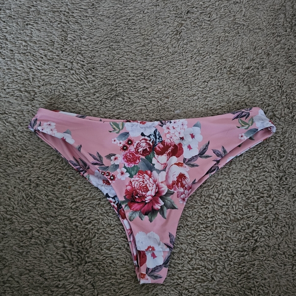 White top with flutter sleeves. Floral print cheeky bottom. Both pieces are size medium but run small. For reference I am 5'8" and 160 lbs.