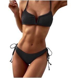 Dive into style with Zaful's black bikini set, featuring a structured bandeau top with a center notch and adjustable side-tie bottoms for a perfect fit. This timeless piece offers a sleek, fitted look ideal for any swim occasion.