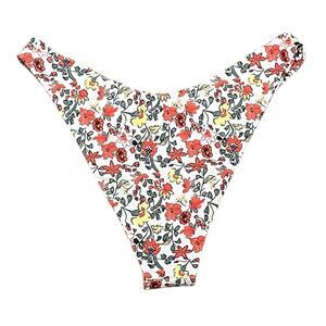 Stylish bikini bottom with a vibrant floral pattern. Features red, yellow, and orange flowers on a white background.
