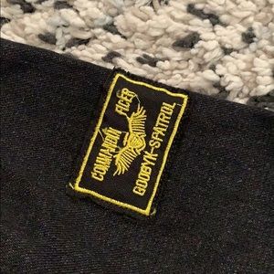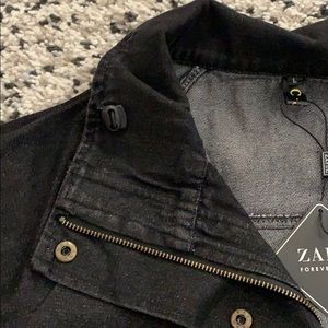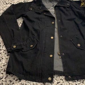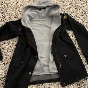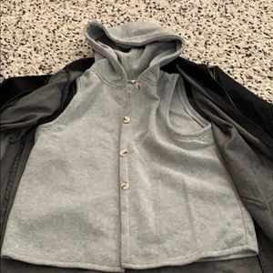 Size Large jean jacket that zips and has buttons. New with tag. Comes with a grey sleeveless hoodie to wear under or without.