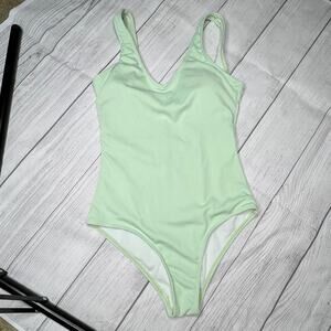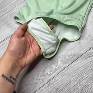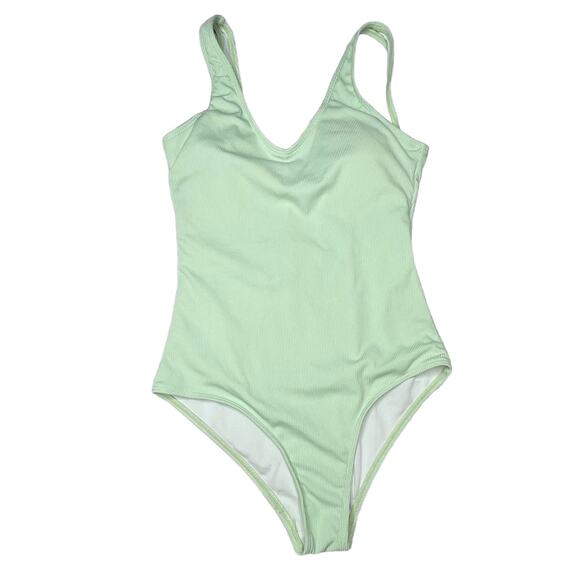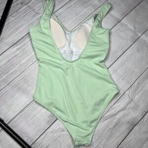 Zaful Sage Green Crinkle Ribbed One Piece Deep Scoop Neck One Piece Swimsuit S