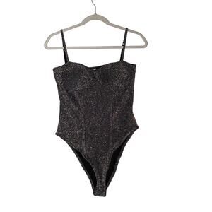 Zaful Sparkle Bodysuit Large Silver Shiny Sleeveless Sweetheart Neckline Low Cut