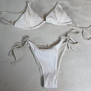 Zaful Women’s Bikini L Beige Halter Ribbed Tie Side Strappy Thong Swim Set