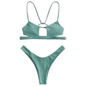 Zaful Women’s Small Bikini Set Green Strappy Cut Out Tie Back Top Thong Bottom