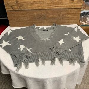 Trendy gray sweater with white star pattern. Features a distressed design. Perfect for casual wear. Definitely would fit up to an XL