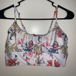 Top is white with a floral design. The bottoms are yellow and mud waisted.