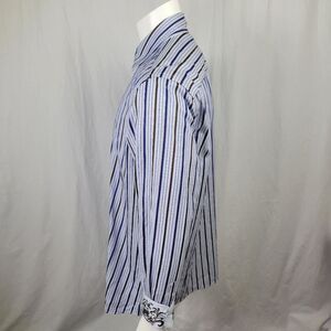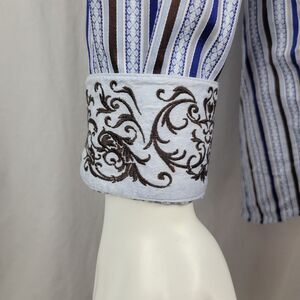 Cotton button down blue and brown striped shirt with brown jacquard flip cuffs! Wear it untucked for a casual look or tuck it in for a more polished look!
