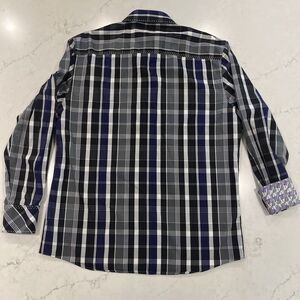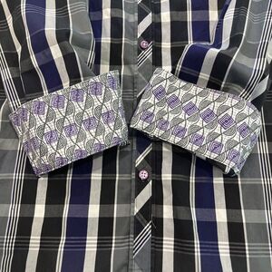 Zagiri Mens Purple Black Plaid Button Up, Contrasting with Geometric Flip Cuffs, White Embroidered Stich, Sz L