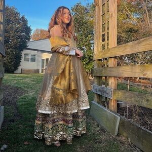 Elegant gold and green dress by Zahra Ahmad. Worn once. Size large. Has three pieces, dupatta, pants/shalwar, & scarf/dupatta. Perfect for Indian or Pakistani wedding or event as a guest.