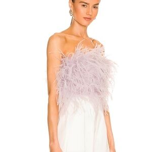 Elegant strapless top with lavender feather detailing. Perfect for a chic look.
