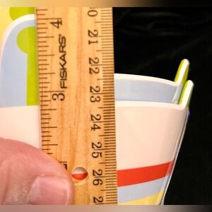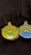 Measures about 5.5 inches across and 4 inches tall. One bowl has clouds on the outside and the other has vibrant stripes.