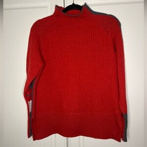Size small mock neck turtleneck sweater in a bold red with asymmetrical color block down the sleeves and checkerboard pattern on the back of the sweater. Merino wool nylon cotton blend. No flaws.