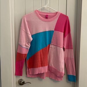 Embrace vibrant style with this colorful patchwork sweater. Featuring a mix of pink, teal, and orange, this sweater adds a playful touch to any outfit.