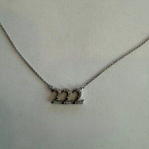 Sparkling diamond-accented "222" necklace in good condition. Sterling silver. The "222" numbers trio is touched with round diamond accents and beading. 18.0-inch rope chain necklace; spring-ring clasp. Plated with rhodium, which may wear off with frequent use.